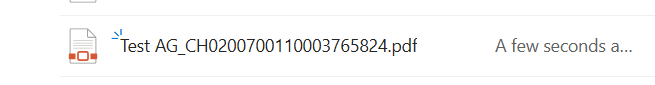 After the flow runs, you'll see a new PDF in the target folder with a name like Test AG_CH0200700110003765824.pdf—creditor name, underscore, Swiss IBAN, and .pdf. Each file is renamed from its own Swiss QR code data, so the flow is fully dynamic and content-based.