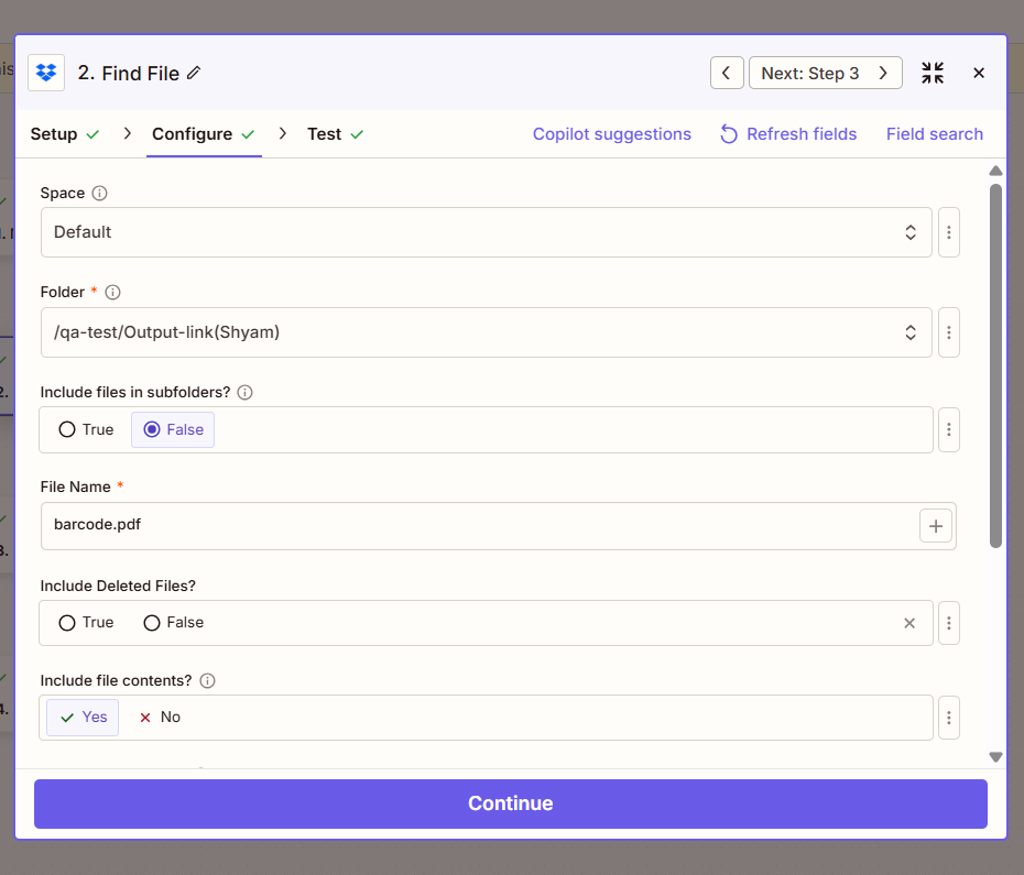 barcode.pdf. You can also map a dynamic value from the trigger (e.g. file name from step 1). - Include Deleted Files? — False unless you need deleted files.