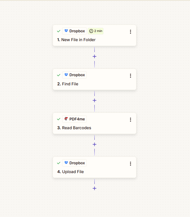 - New to PDF4me + Zapier? — Connect PDF4me to Zapier walks you through the connection. Then open Zapier → Create Zap → add trigger New File in Folder (e.g. Dropbox) → Find File → Read Barcodes (PDF4me) → Upload File.
