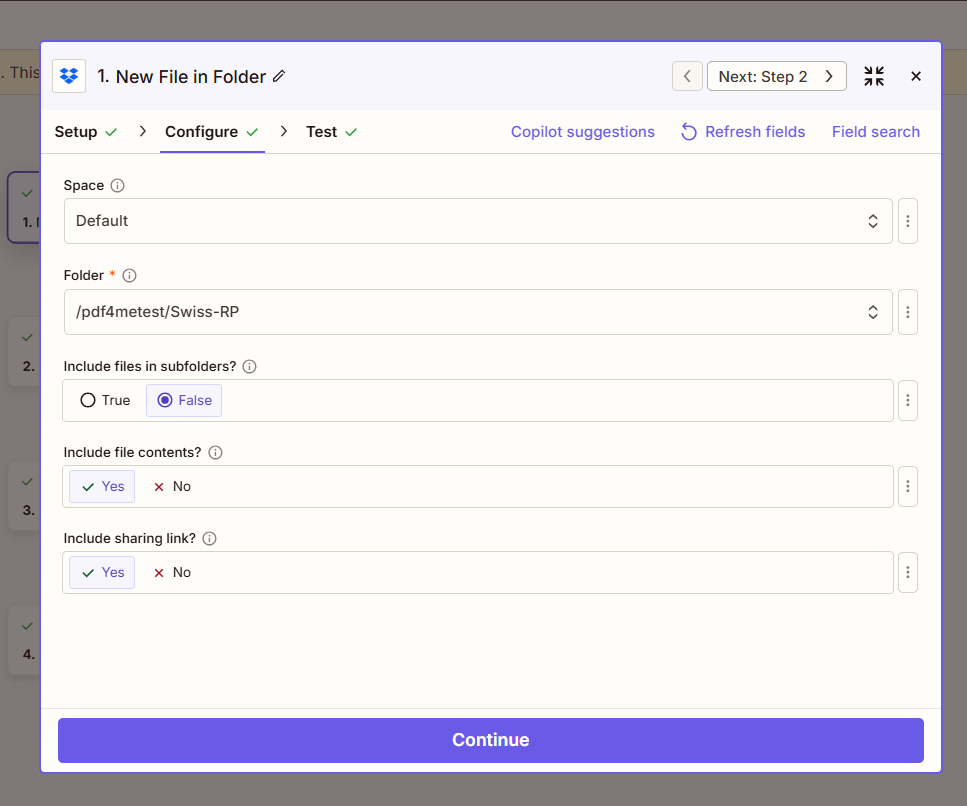 - Build the Zap from scratch — Follow Steps 1–4 above: trigger folder e.g.