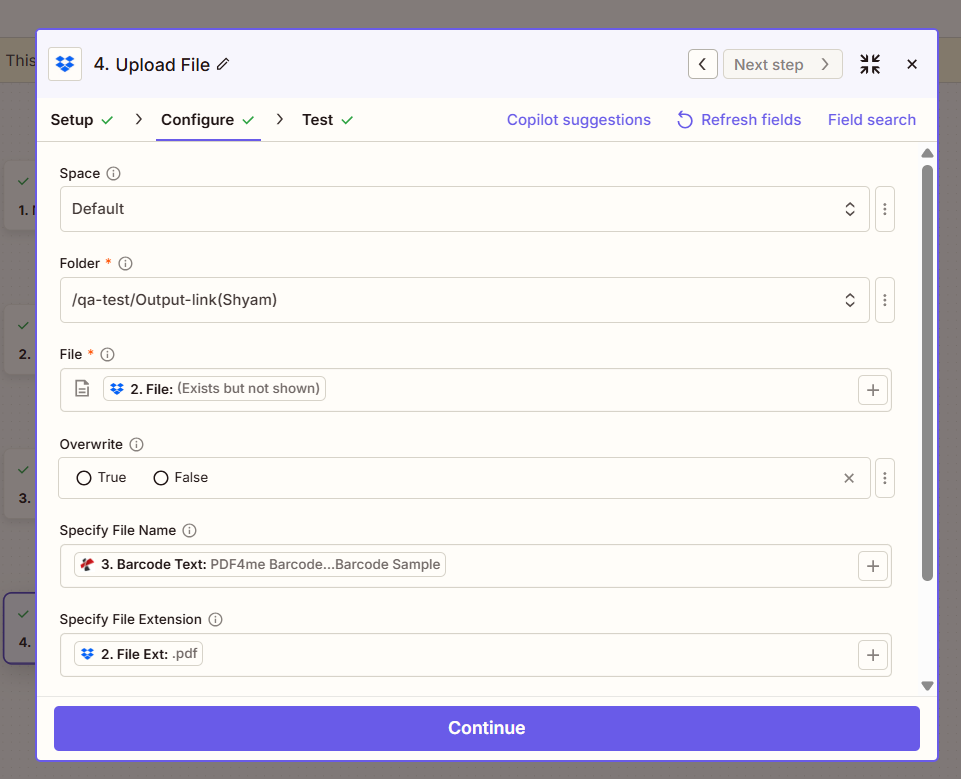/pdf4metest/Swiss-RP(Include file contents Yes) → Find File in e.g./qa-test/Output-link(Shyam), File Namebarcode.pdf, Include file contents Yes → Read Barcodes with File from step 2, barcode types All Types → Upload File with File from step 2, Specify File Name = 3. Barcode Text, Specify File Extension = 2. File Ext, Overwrite as needed. - Full action reference — Read Barcodes — Zapier for all parameters and output.
