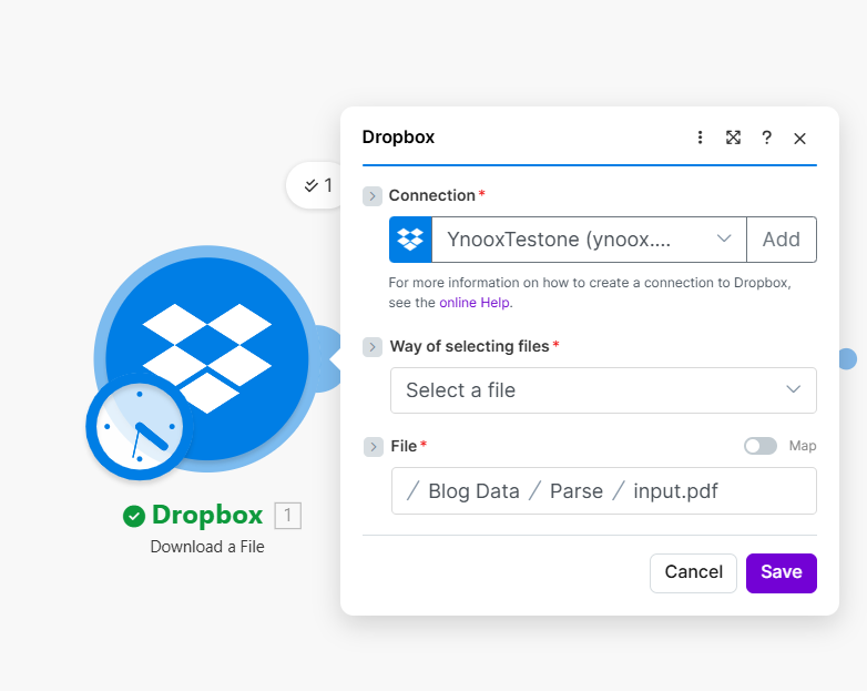 | 1 | Dropbox – Download a File | Input: /Blog Data/Parse/input.pdf |