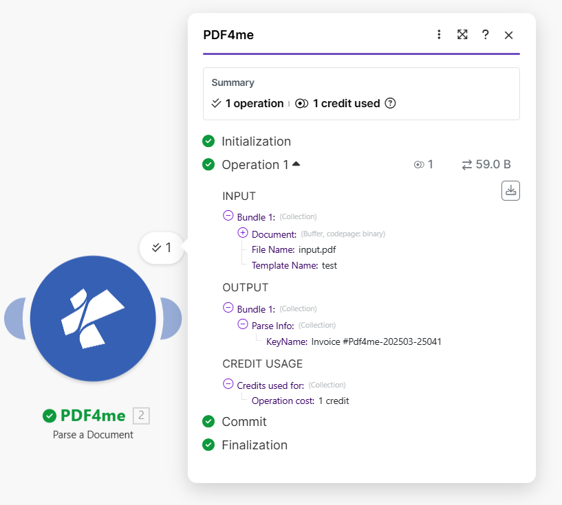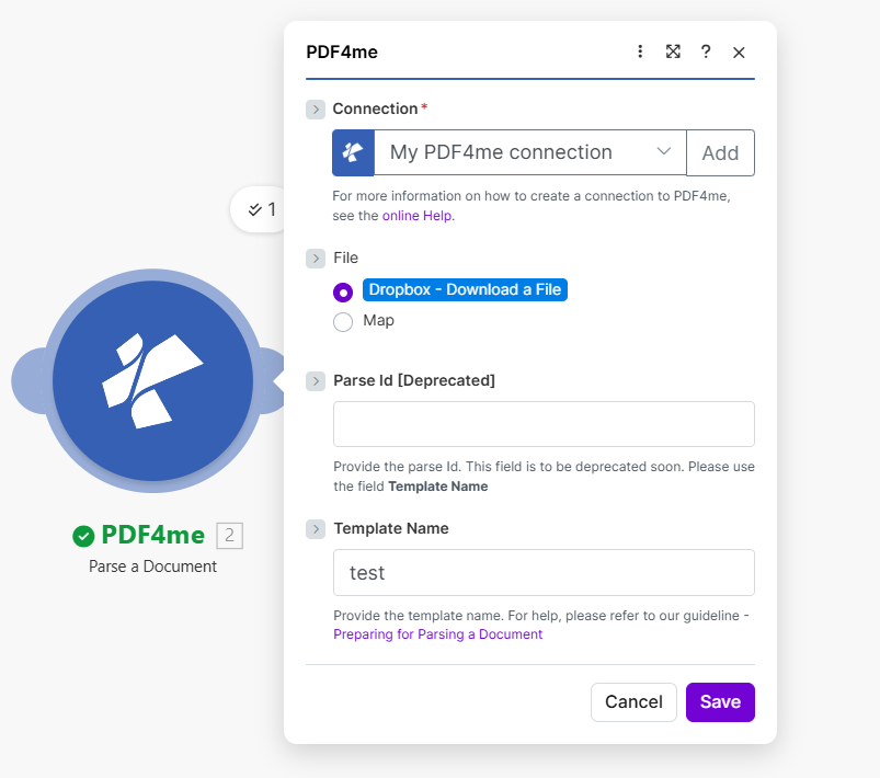| 2 | PDF4me – Parse a Document | Template: test, Output: KeyName |