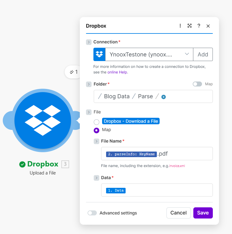 test) and returns Parse Info. - Dropbox – Upload a File — Saves the same file with a new name from Parse Info.