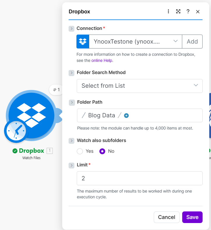 /Blog Data/. Use the folder picker (plus icon) if available. The module can handle up to 4,000 items per execution cycle. - Watch also subfolders — No to watch only the chosen folder; set Yes to include subfolders.