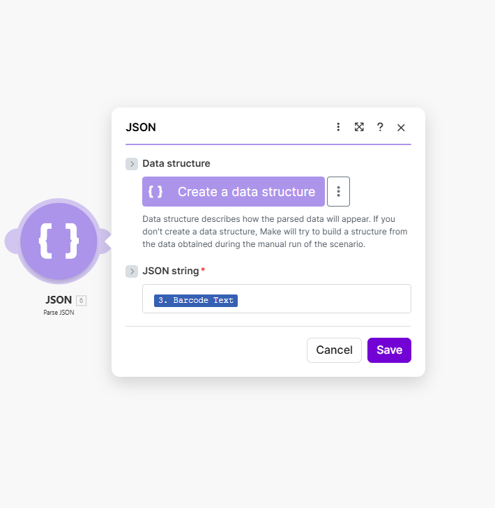 - JSON string * — Click map and select 3. Barcode Text from PDF4me – Read SwissQR Code. This is the raw JSON output from the previous module. Make will parse it so fields like