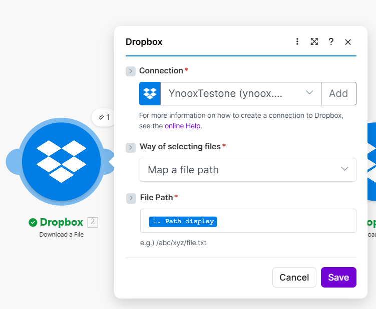 - Add Dropbox → Download a File.
