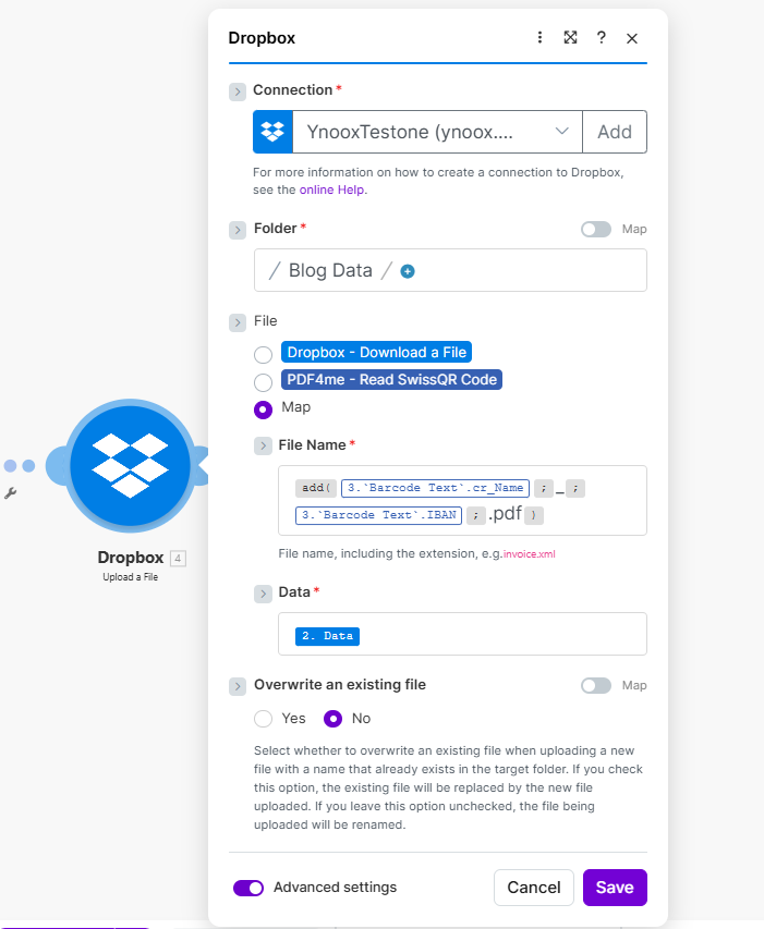 .pdfextension. Example from the screenshot:add(3.'Barcode Text'.cr_Name, 3.'Barcode Text'.IBAN, '.pdf')— this uses creditor name and IBAN from module 3 (Read SwissQR Code). You can use other fields (e.g. reference, amount) or add separators like'_'inside add(). The tooltip reminds you: “File name, including the extension, e.g. invoice.xml”. - Data * — Map to 2. Data from Dropbox – Download a File. This is the PDF content you are uploading. Do not use the output of Read SwissQR Code or Parse JSON here—those modules return data, not the file.