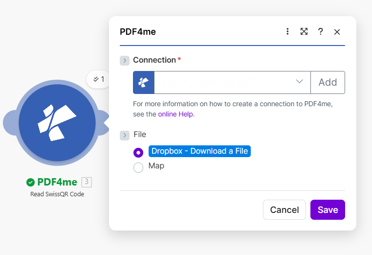 cr_Name,IBAN) when building the upload filename. JSON string is mapped to 3. Barcode Text. - Dropbox – Upload a File — Uploads the same PDF (from Download) to a folder. You map the file content from 2. Data and set File Name using an expression that combines Swiss QR fields (e.g.