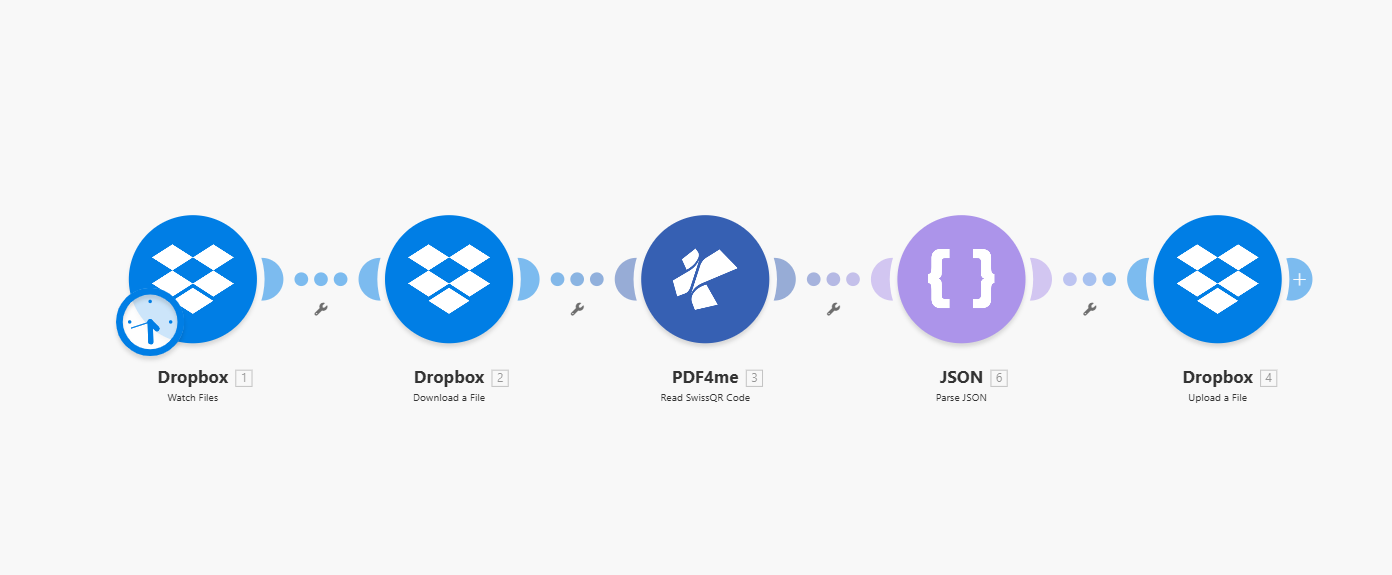 - Build the scenario — Add the five modules (Dropbox Watch Files → Dropbox Download a File → PDF4me Read SwissQR Code → JSON Parse JSON → Dropbox Upload a File) and map the fields as in Steps 1–5. In Upload, set Data to 2. Data and File Name to your add() expression with 3. Barcode Text fields.