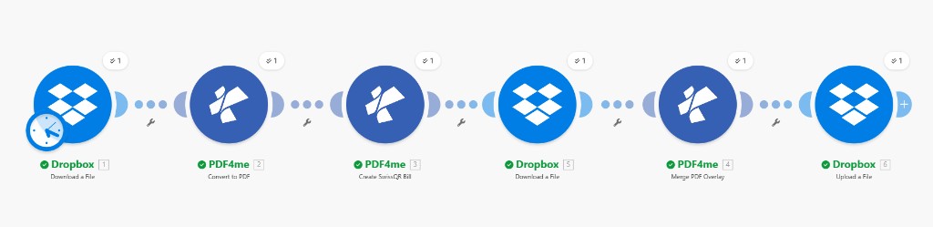 Final_output.pdfappears in the output folder with base content and Swiss QR Bill visible. - Automate — Add a trigger (e.g. Watch Dropbox folder or Schedule) so new or updated files in the folder run the scenario automatically.
