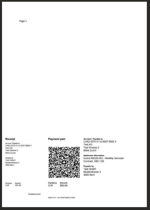 CH0200700110003765824), Creditor (Test AG, Test Strasse, 2, 8004, Zurich), Ultimate Debtor (Test GmbH, Musterstrasse, 3, 3000, Bern), Reference Type NON, Language English, Separator Line With Scissor. Optional: Unstructured Message (e.g. invoice #2026-003 - Monthly Services), Billing Info (Contract: ABC-123), AV1 Parameters (e.g. Name AV1: UV;UltraPay005;12345).