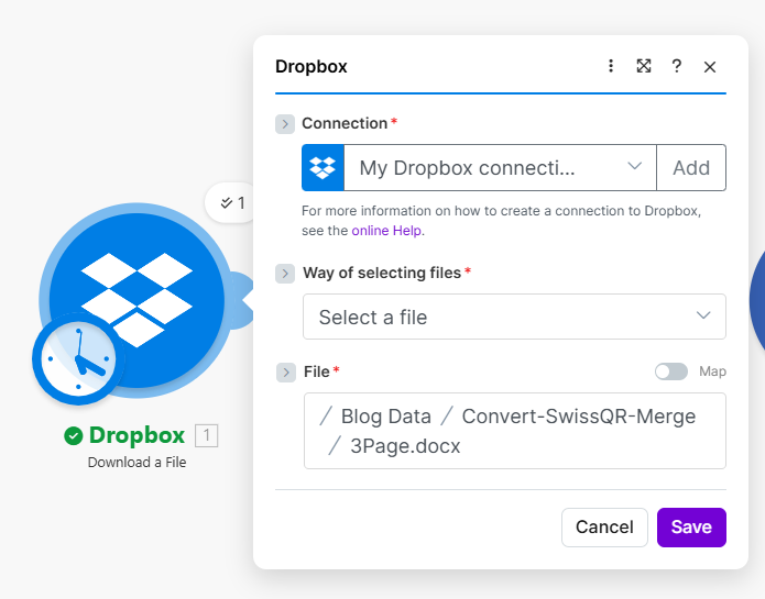 - File — Select Dropbox – Download a File (the Word file from step 1). Alternatively use Map and choose the step 1 file output.