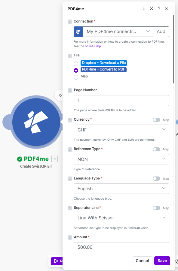 - File — PDF4me – Convert to PDF (so the QR bill is created from or added to the converted PDF). Page Number — 1 (the page where the Swiss QR Bill is to be added).