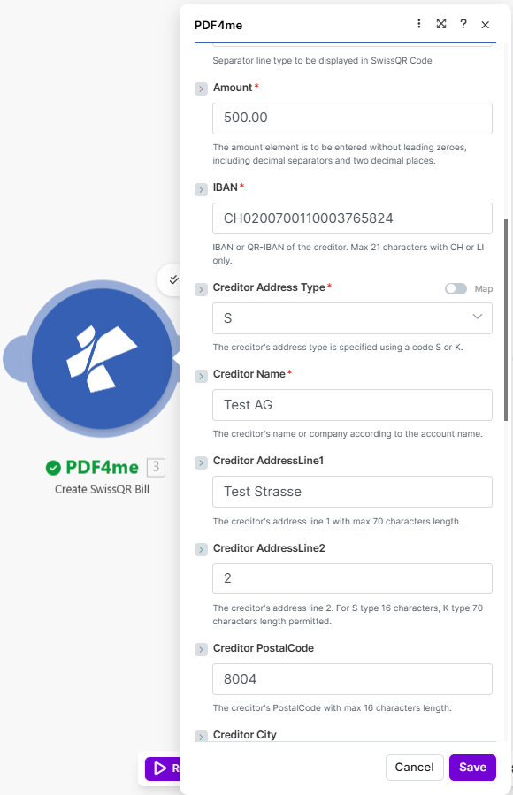 | PDF4me Create SwissQR Bill (3) | File, Page Number, Amount, Currency, IBAN, Creditor, Debtor | Convert to PDF; 1; 500.00; CHF; Test AG / Test GmbH; optional message, Billing Info, AV1 |