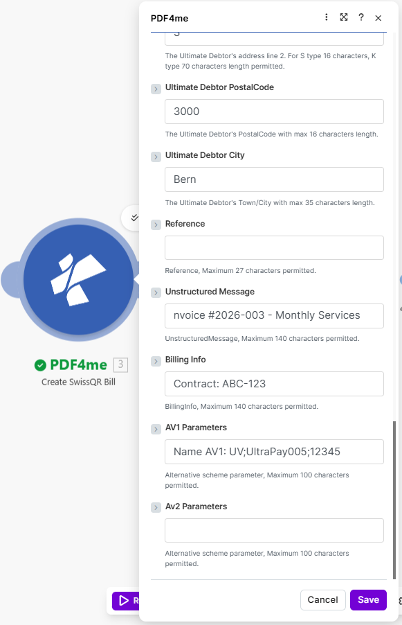 invoice #2026-003 - Monthly Services. Billing Info — e.g.Contract: ABC-123. AV1 Parameters — e.g.Name AV1: UV;UltraPay005;12345. Reference and AV2 optional. - Save. The module returns Name and Document (e.g. 3. Name, 3. Document), used as the Layer in Merge PDF Overlay.