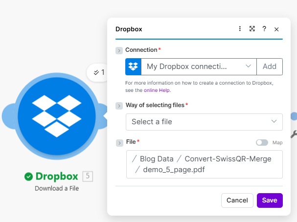 Dropbox Download a File configured for demo_5_page.pdf in / Blog Data / Convert-SwissQR-Merge /. Map 5. File Name and 5. Data to Merge PDF Overlay as Base.