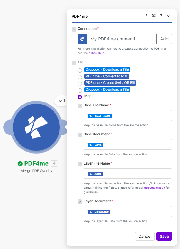 | PDF4me Merge PDF Overlay (4) | Base (Name + Document), Layer (Name + Document) | 5. File Name, 5. Data; 3. Name, 3. Document |