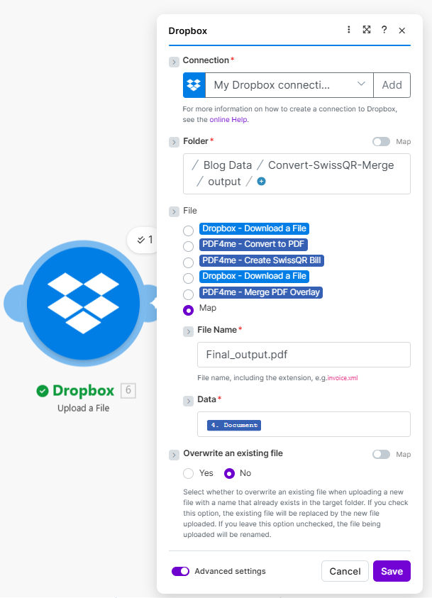 | Dropbox Upload (6) | Folder, Data, File Name, Overwrite | .../output/; 4. Document; Final_output.pdf; No |