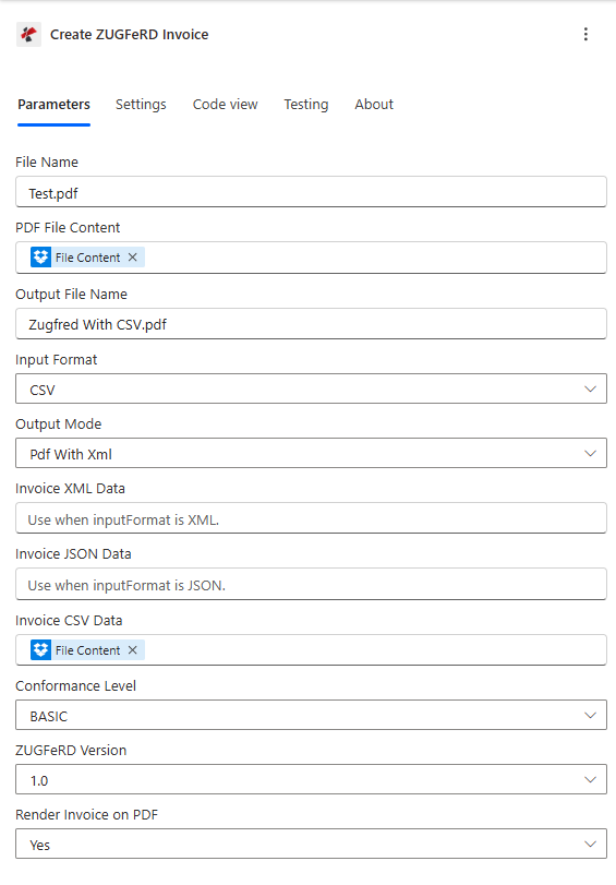 - Add Create ZUGFeRD Invoice to your flow.