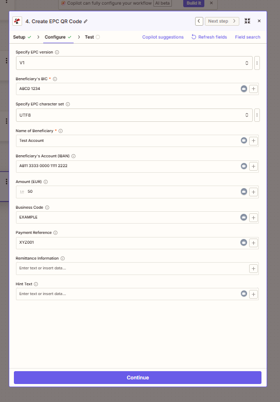 PDF4me Create EPC QR Code action in Zapier generates compliant European Payment Council (EPC) QR codes for SEPA payment initiation. The EPC QR standard enables customers across Europe to scan and pay invoices instantly via mobile banking apps—no manual data entry. Configure beneficiary details, IBAN, amount, and payment reference directly in the Zapier Configure step; all fields are fact-checked from the live Zapier interface. Connect with accounting apps, invoicing tools, and CRM systems to automate payment QR code generation for European invoices, subscriptions, and business transactions.